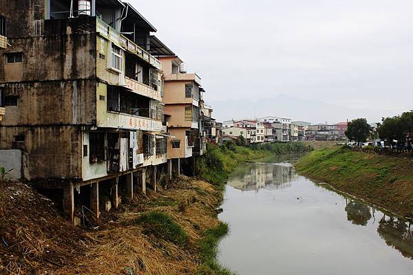 在橋上看的美濃溪畔的住家風情。